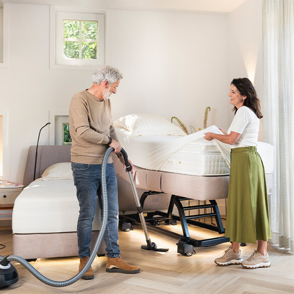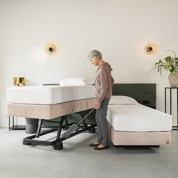 Veel senioren zien op tegen het stofzuigen onder en rondom hun bed. Dit is begrijpelijk, want het is een inspannende taak en u kunt overal moeilijk bij. Met een deel- en verrijdbaar seniorenbed, plaatst u beiden eenvoudig uit elkaar. Bij de LevelFit bedden plaatst u het bed met één druk op de knop omhoog. Hierdoor kunt u met rechte rug overal bij. Stofzuigen is in een handomdraai gebeurd!