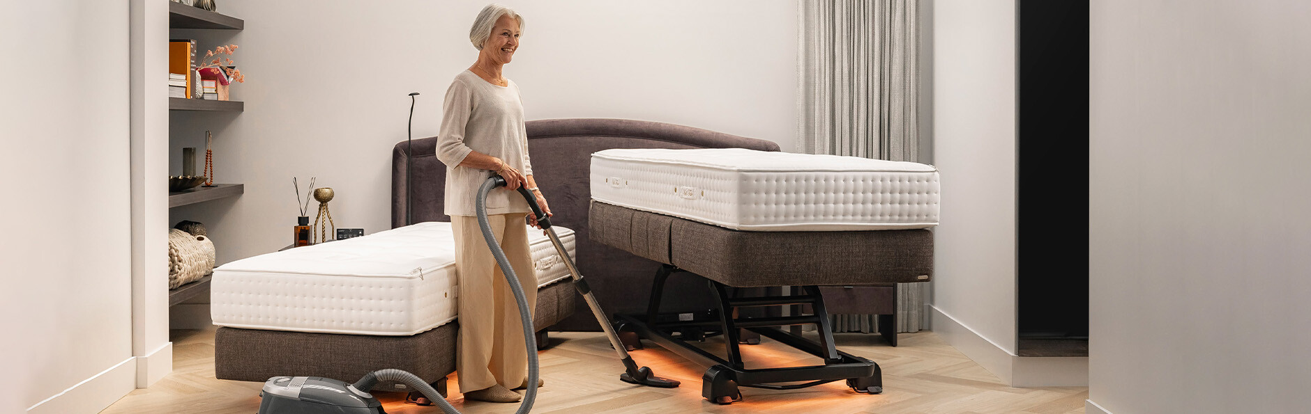 Een in hoogte verstelbaar bed maakt het schoonmaken onder het bed eenvoudig. U kunt het bed omhoog zetten, waardoor er meer ruimte ontstaat om te stofzuigen of schoon te maken. Dit helpt stofophoping te voorkomen en zorgt voor een schonere slaapomgeving. Bij Well-Fair combineren we comfort met gebruiksgemak in elk in hoogte verstelbaar bed dat we aanbieden.